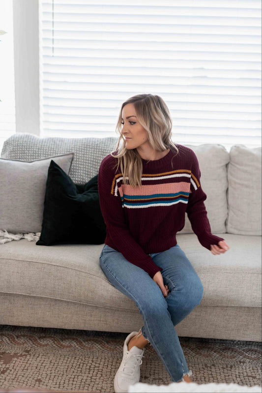 Suéter de cuello redondo, manga larga y corte bajo con rayas múltiples