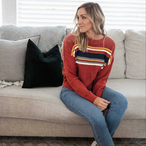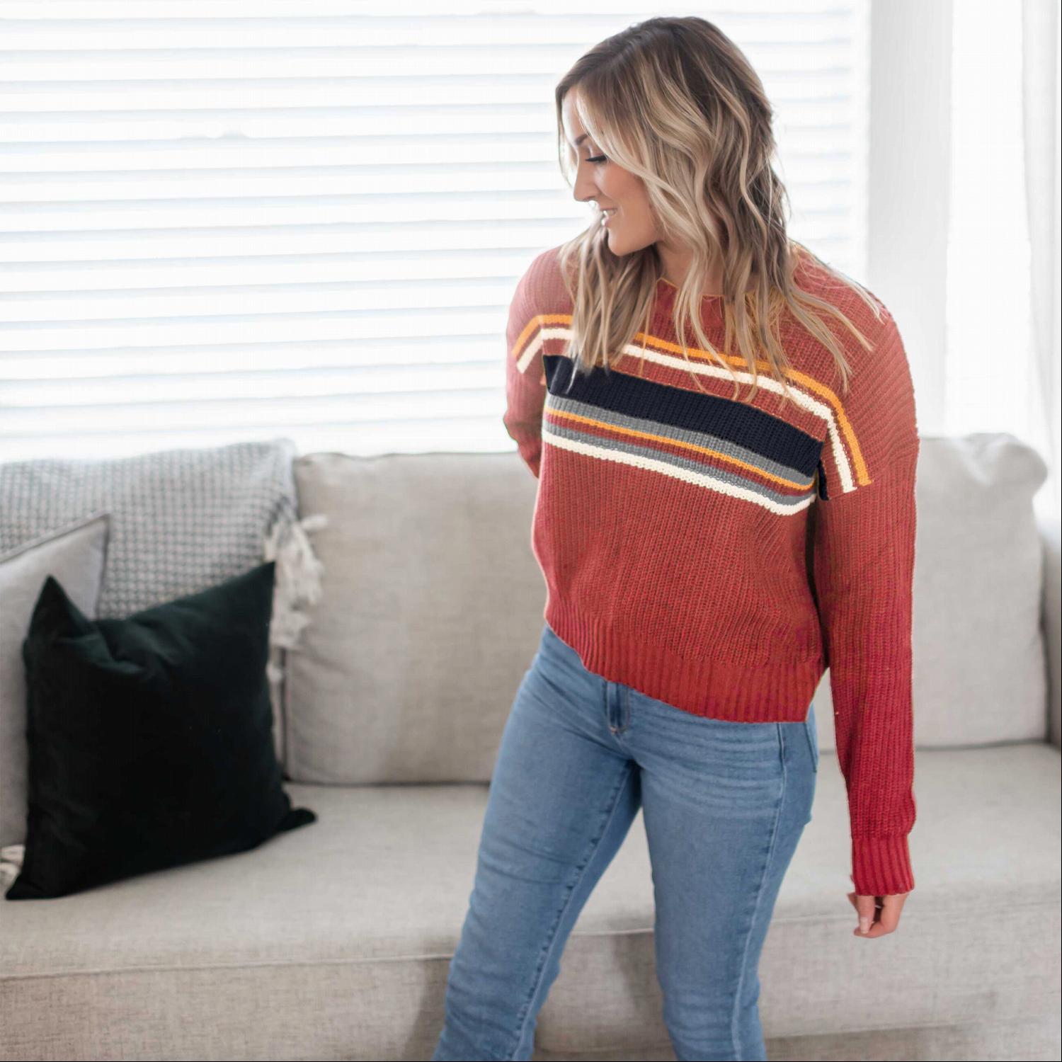 Suéter de cuello redondo, manga larga y corte bajo con rayas múltiples