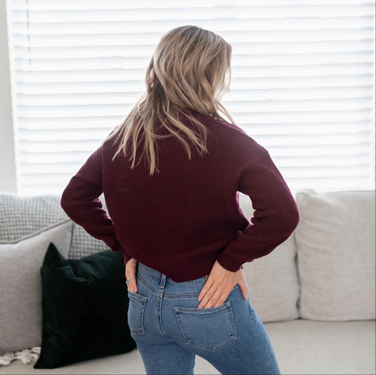 El suéter tiene un ajuste relajado y llega hasta la cadera.