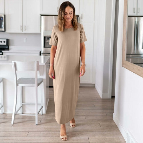 Este vestido de corte relajado presenta mangas de camiseta alargadas y se extiende hasta los tobillos para darle un toque elegante y modesto.