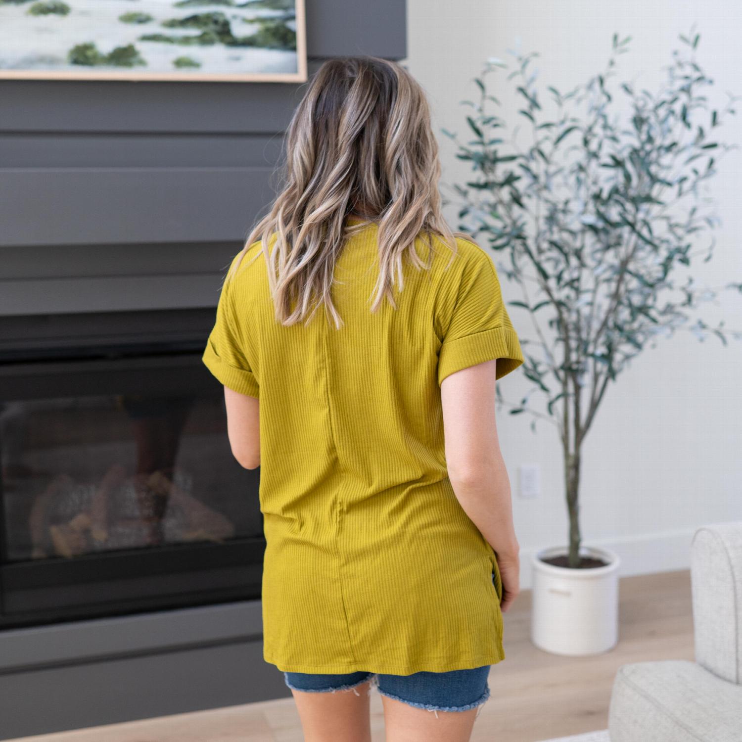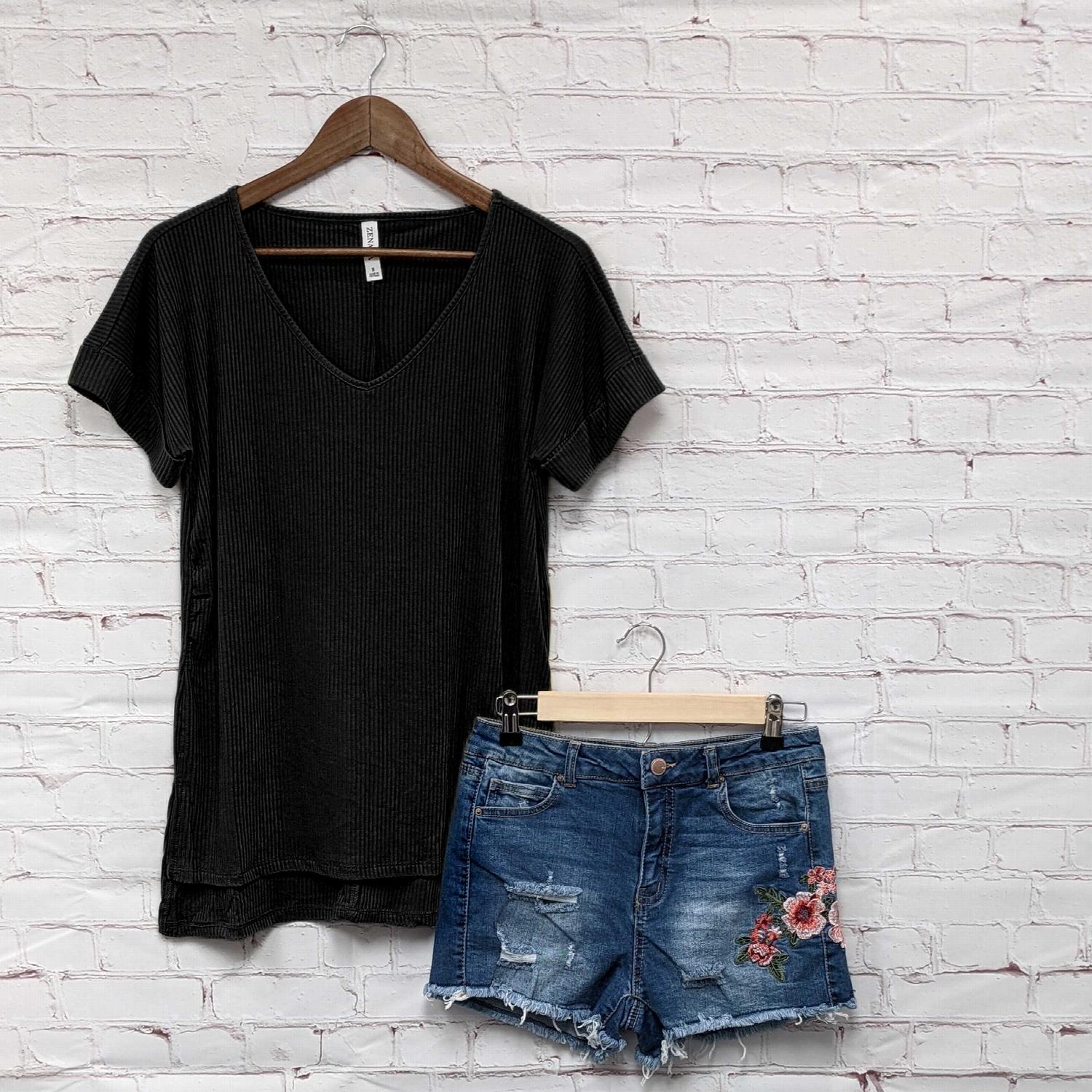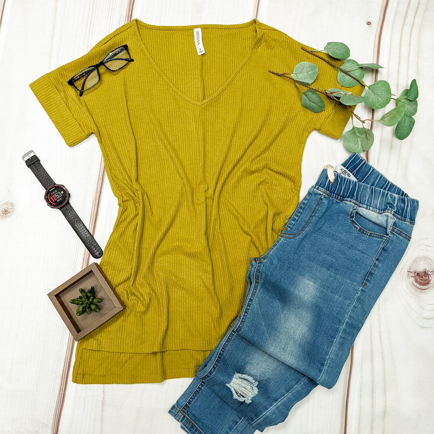 Top de canalé con escote en V, dobladillo alto y bajo con aberturas laterales