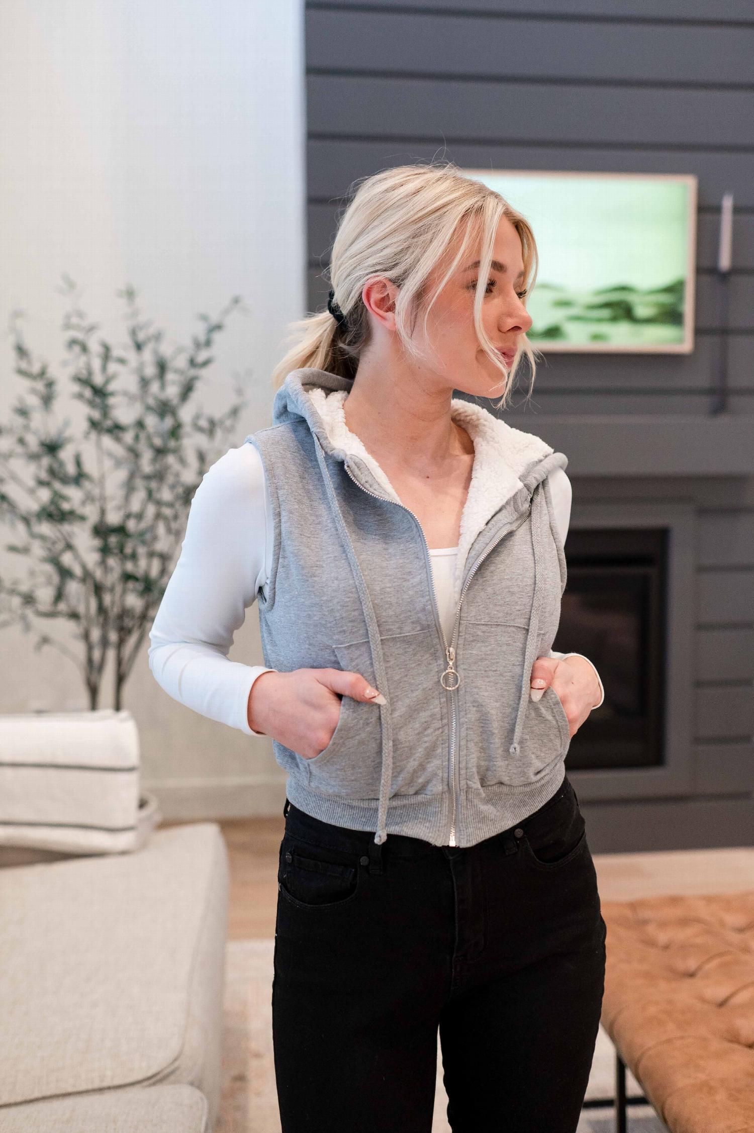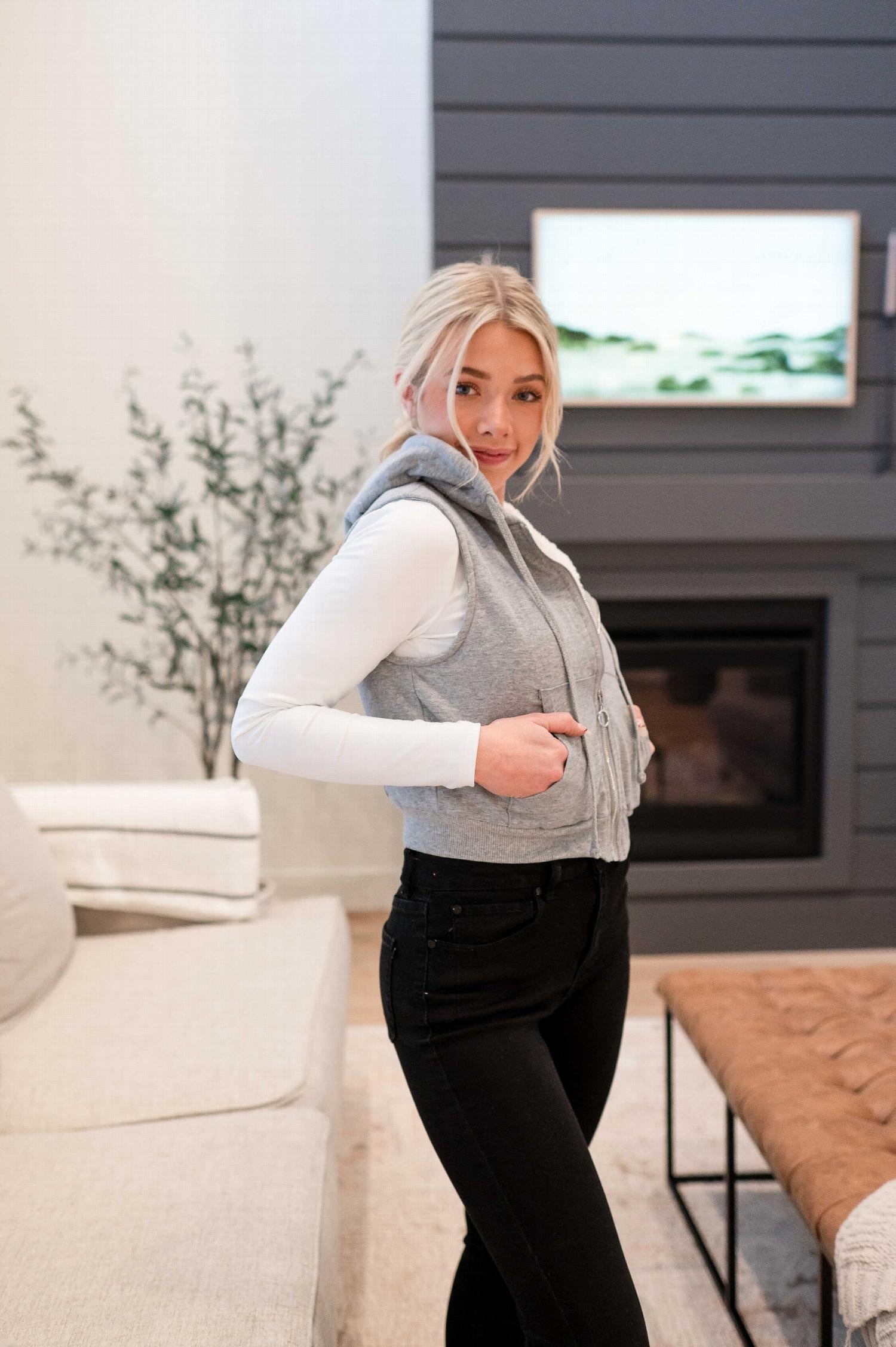 Lindo para cualquier temporada, este chaleco con capucha de estilo abierto no tiene mangas y tiene bolsillos.