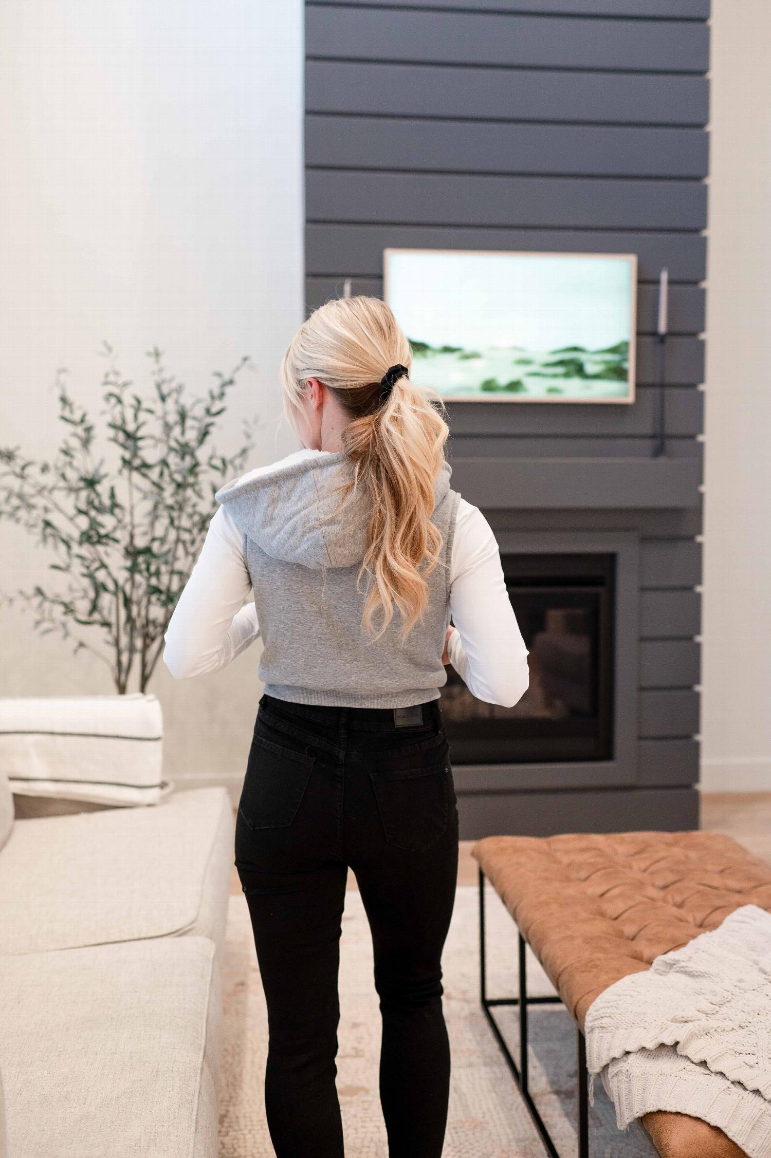 Con un estilo que imita a un chaleco, el abrigo llega justo por encima de la cadera y es perfecto para darle el toque final a un conjunto de otoño.
