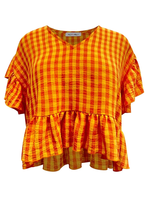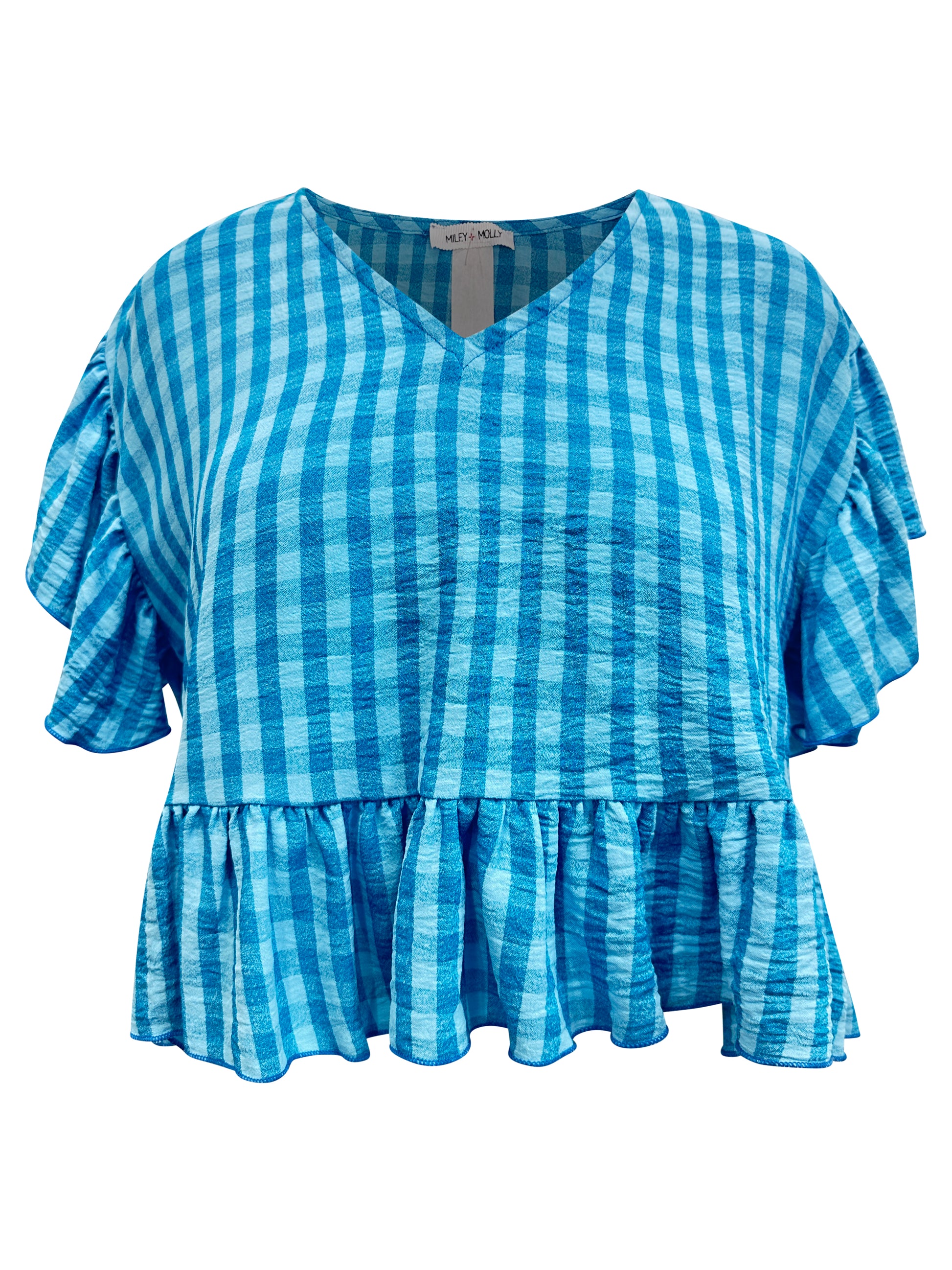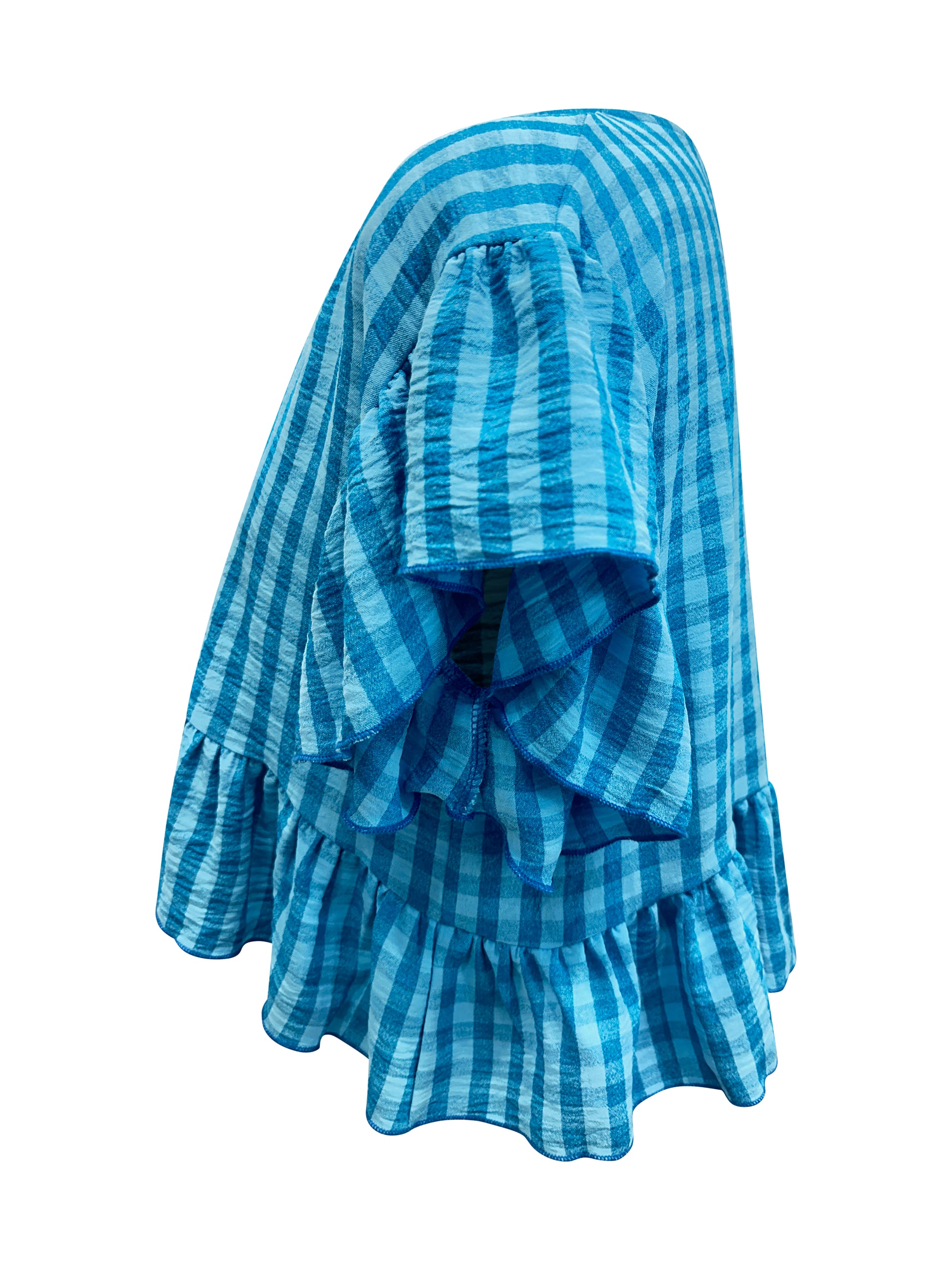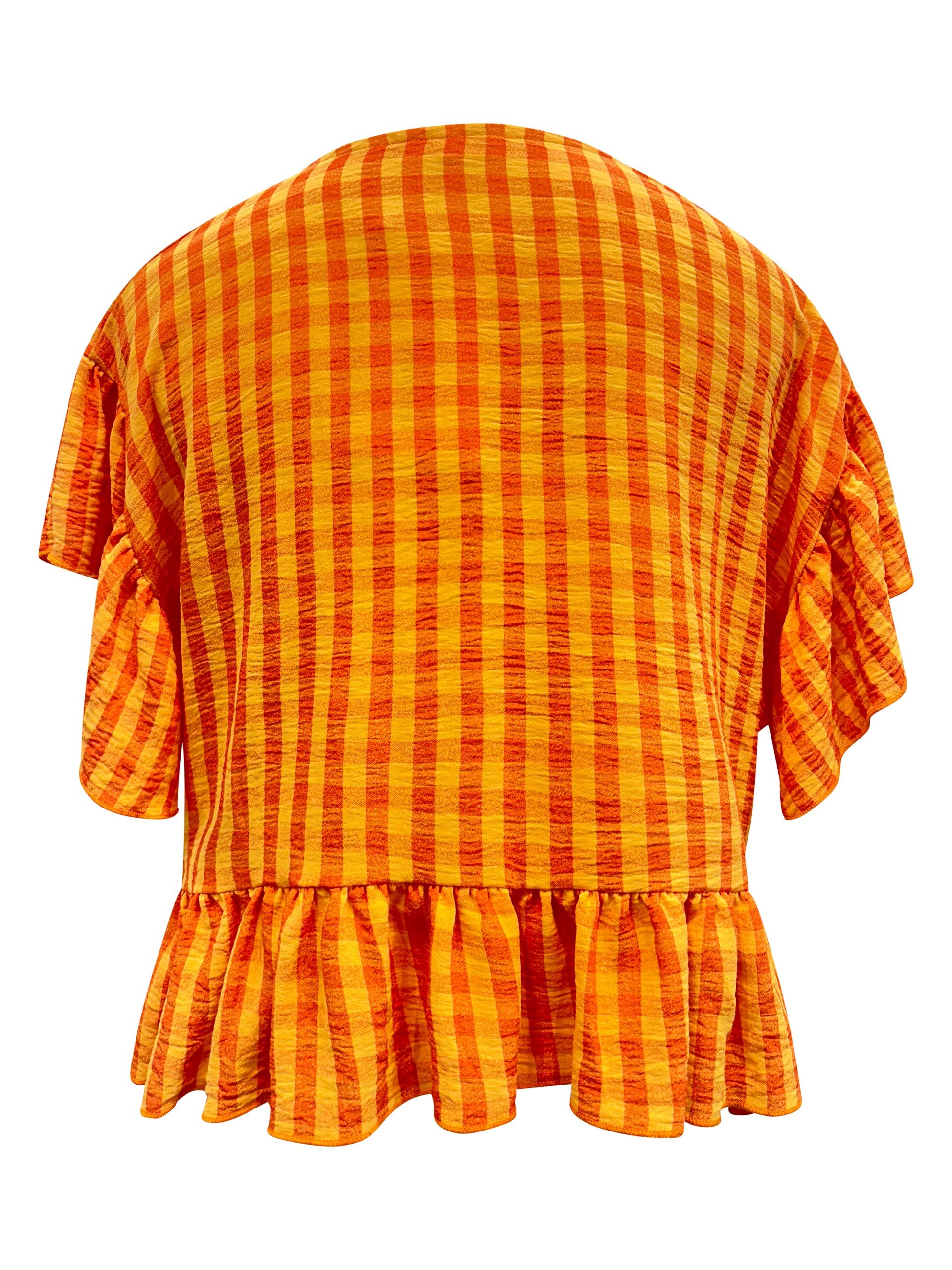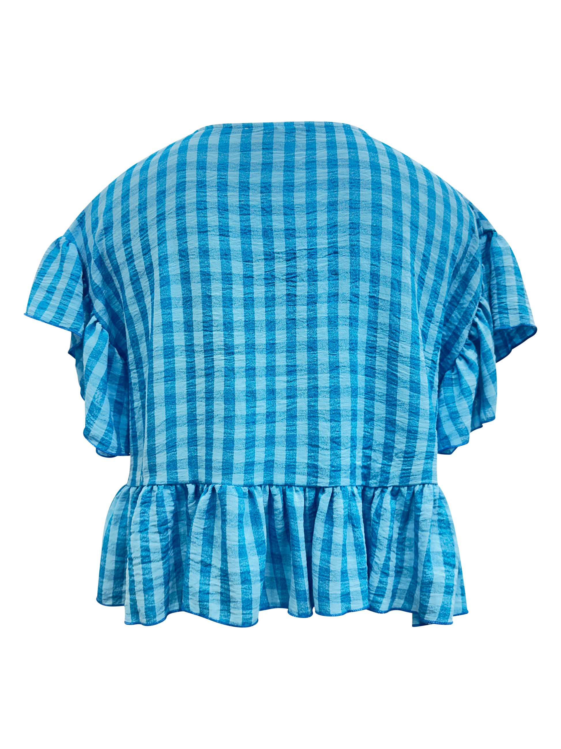 Top corto holgado con escote en V, mangas acampanadas y bajo con volantes en cuadros con efecto transpirable
