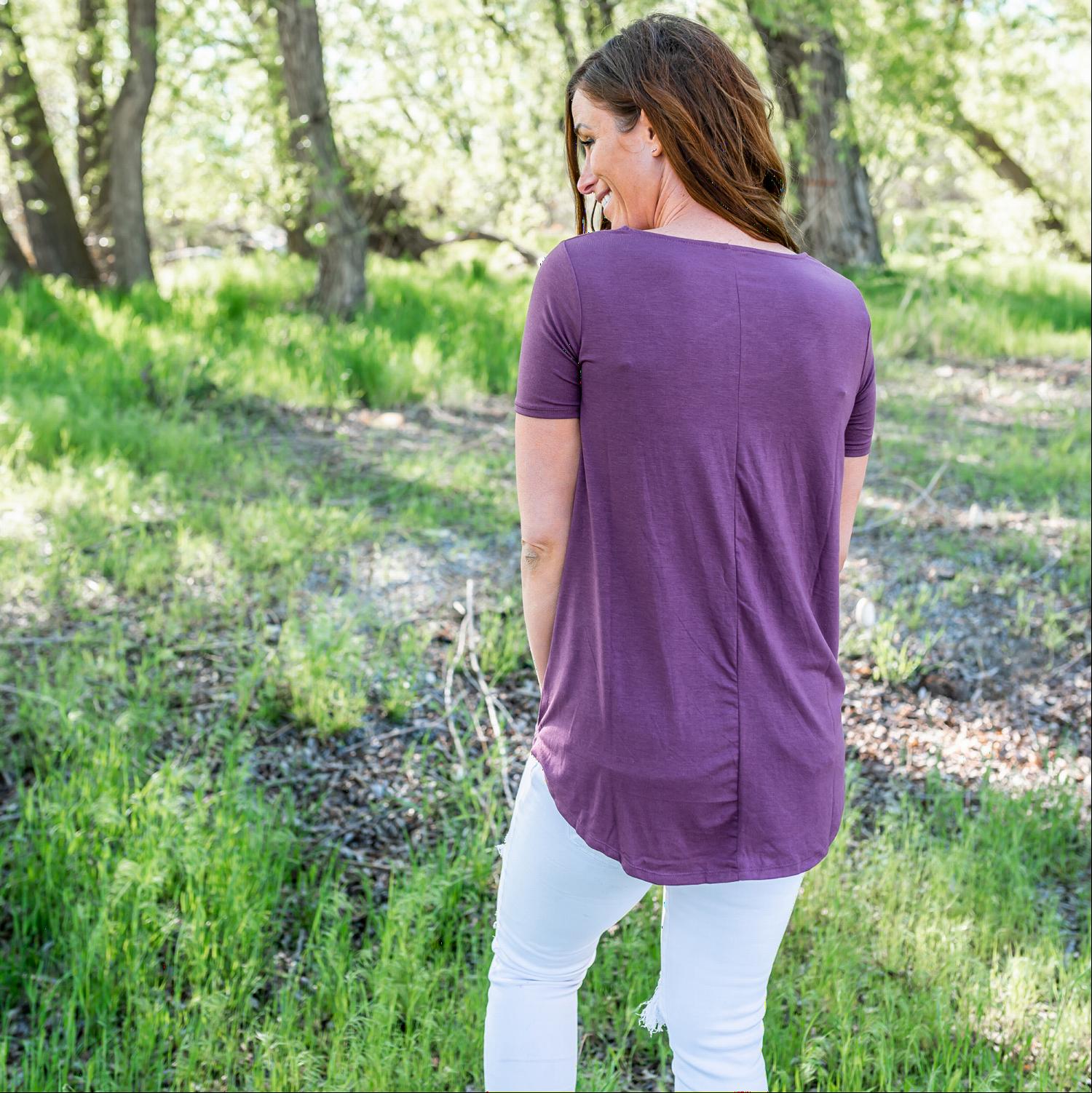 Tiene un dobladillo largo y curvo que se ajusta al cuerpo, sin quedar ceñido. Llévalo con pantalones capri negros, vaqueros desgastados o shorts de cintura alta.