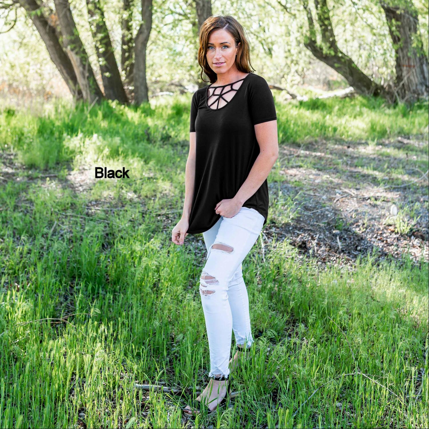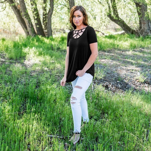 Una alternativa divertida y elegante a tus tops y camisetas básicos y lisos; este top de manga corta cuenta con un detalle de corte de red.