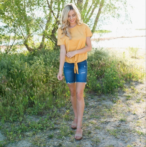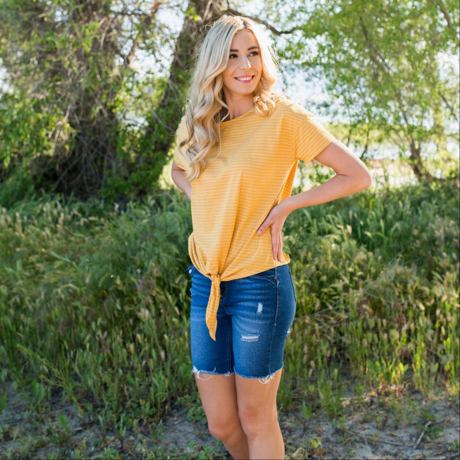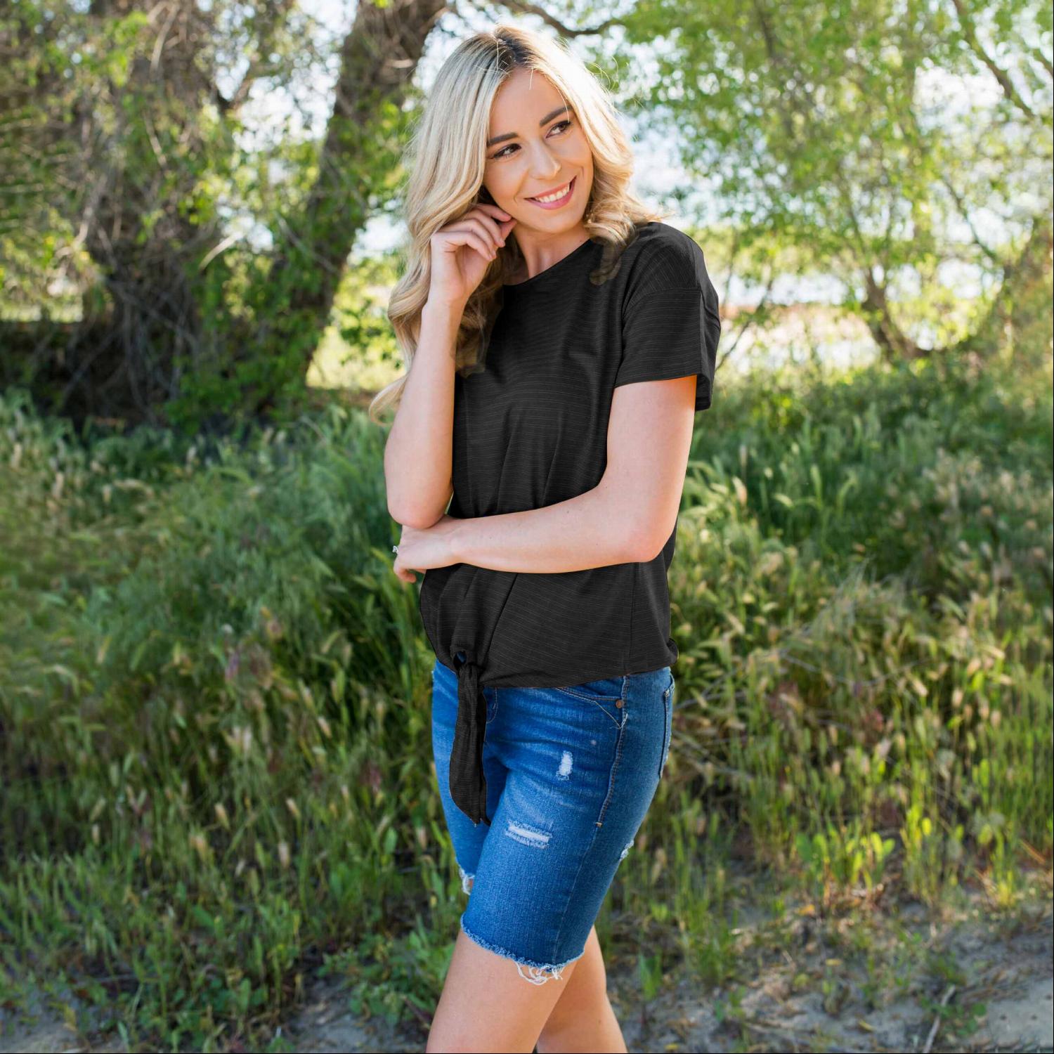Este top holgado de punto básico en tonos sólidos se ata en la parte delantera y combina perfectamente con jeans o pantalones cortos de mezclilla.