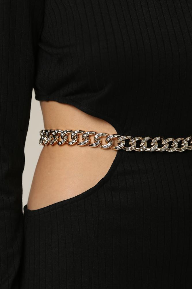 A ribbed maxi dress featuring high-neck. Cutout waist with rhinestone encrusted chain belt that adjusts. Long sleeves. Front leg slit. Zipper back closure. Finished hem.