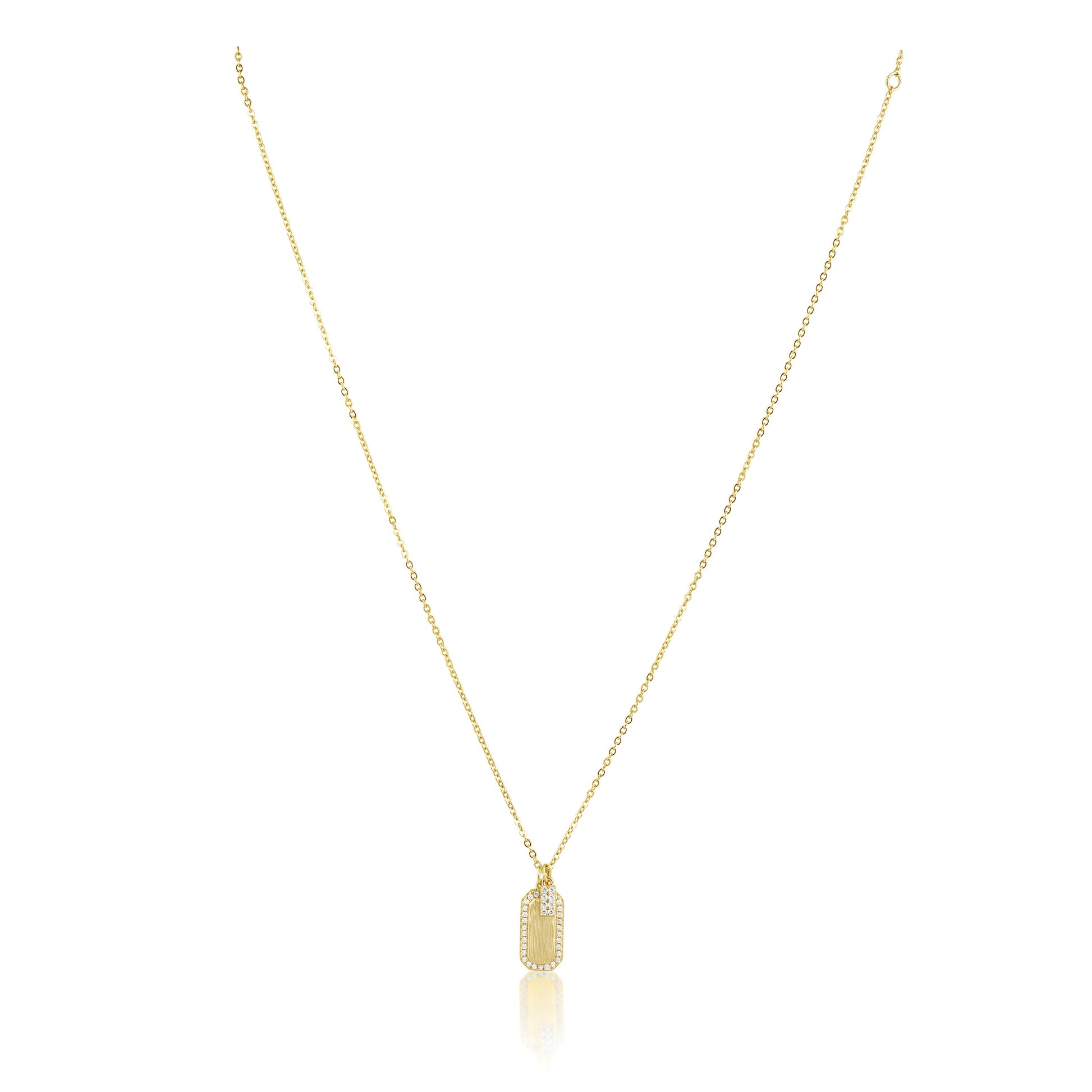Elevate your style with our Mini Dog Tag Necklace. With a sleek matte finish and sparkling CZ stones, this necklace adds a touch of sophistication to any outfit.